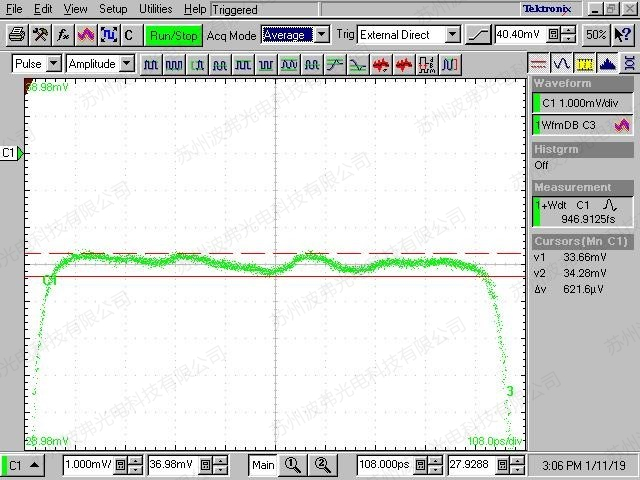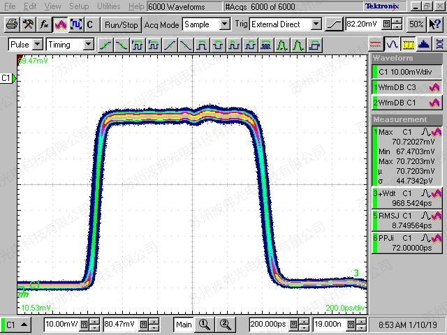 如图所示,60 000个脉冲叠加,我们可以看到低振荡和抖动的脉冲优异性,这个测量证明了ModBox-Front-end高稳定和可靠性的脉冲产生性能。