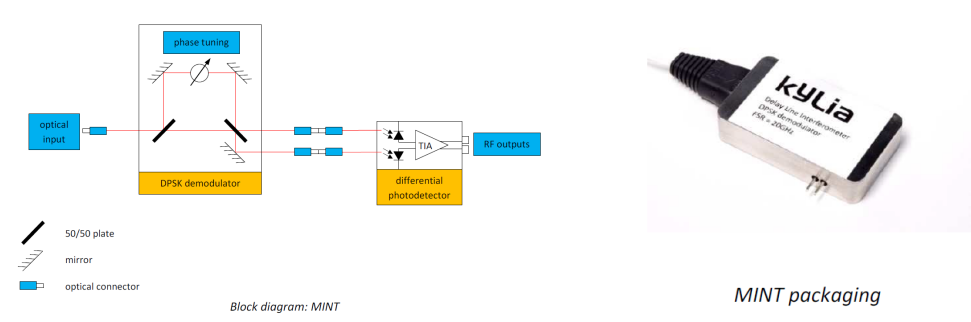 当对传输速率的需求高于Gbit/s时,必须开发新的调制和解调技术。基于自由空间设计和长期的电信技术背景,iXblue能够为这种复杂的解调提供各种产品。其中一系列产品(iXblue MICS系列,请联系我们提供更多资料)致力于多路复用和解复用,这意味着能够在一根独特的光纤中传输许多不同波长的激光(即40路不同波长的激光束在一根典型的电信光纤中传输,1528至1560 nm,C波段,)。另一系列产品(iXblue MINT系列,见下图)使用光的另一个特性进行解调,即电磁波的相位,相位(0或π)的调制比强度的调制更容易、更快。MINT产品使光学DPSK(差分相移键控)解调成为可能,它适用于大约10 Gbit/s的更高传输速率。i