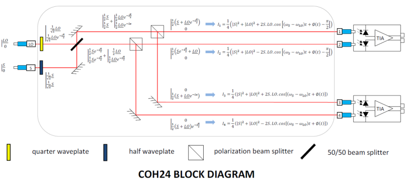 随后产生了“QAM”技术,这是一种使用电磁波相位和强度的调制技术。除了前面的优点之外,该解决方案允许使用中间值(0和1之间,0和π之间)进行调制。它为信息编码提供了更多的可能性。例如,QAM16和QAM64技术可以在单位比特时间内处理4到6比特。这种信号的解调非常复杂,可以通过iXblue 90°光学混频方案(iXblue COH系列,见下图)实现。信号光的相位、振幅甚至偏振态,通过信号光和本振光(特定频率的参考光)之间执行四次90°相位干涉。