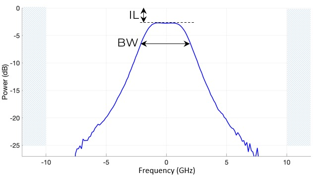 典型响应(IN ➙ OUT):允许传输特定窄带,抑制C或L波段中其他波长。提供从1 -4 GHz多个带宽选择